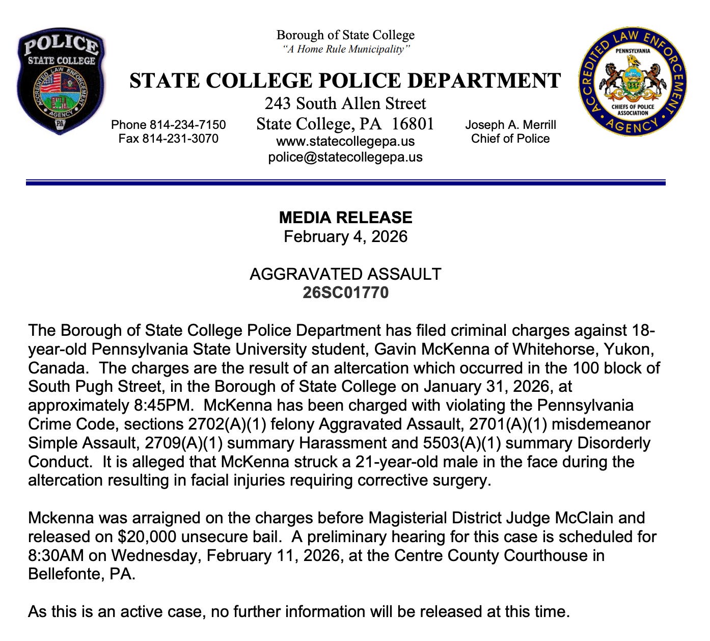 — According to State College Police, the incident occurred around 8:45 p.m. McKenna was arraigned on the charges before Judge McClain and released on $20,000 unsecured bail. He has a preliminary hearing scheduled for 8:30 a.m. next Wednesday (Feb. 11).