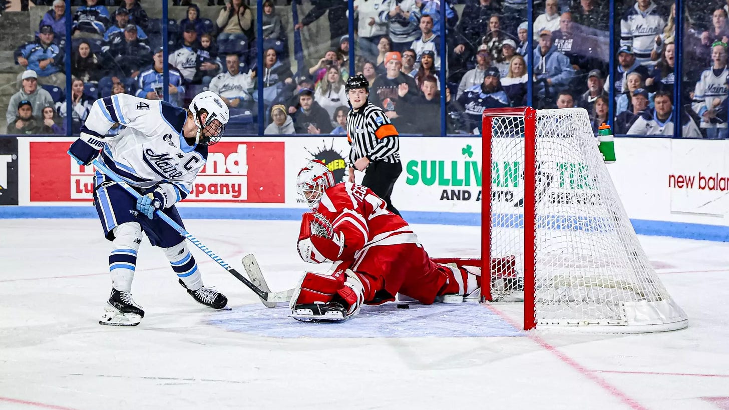 Maine 8, Boston University 5: The Black Bears won a wild one in Orono to complete the weekend sweep, following Friday’s overtime win. The game featured three shorthanded goals—two by BU—and the Terriers took five straight penalties in the third period. Charlie Russel (2g, 1a) and Max Scott (2g, 1a) each scored twice for Maine, while Brandon Holt chipped in three assists. For BU, Brandon Svoboda posted a four-point night (2g, 2a) and Cole Hutson added three assists.