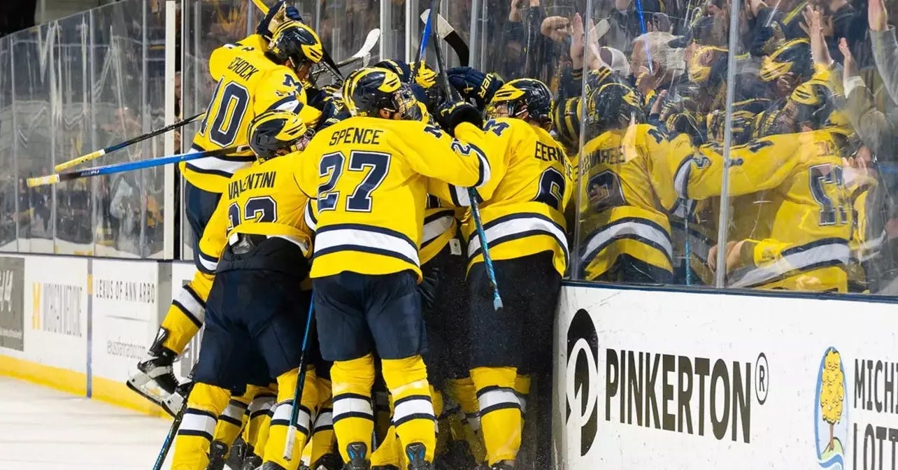 It was a night that refused to end on time across college hockey. Nine games required overtime to decide matters, headlined by Michigan’s extra-session victory over Michigan State in a No. 1 vs. No. 2 showdown in the NPI.