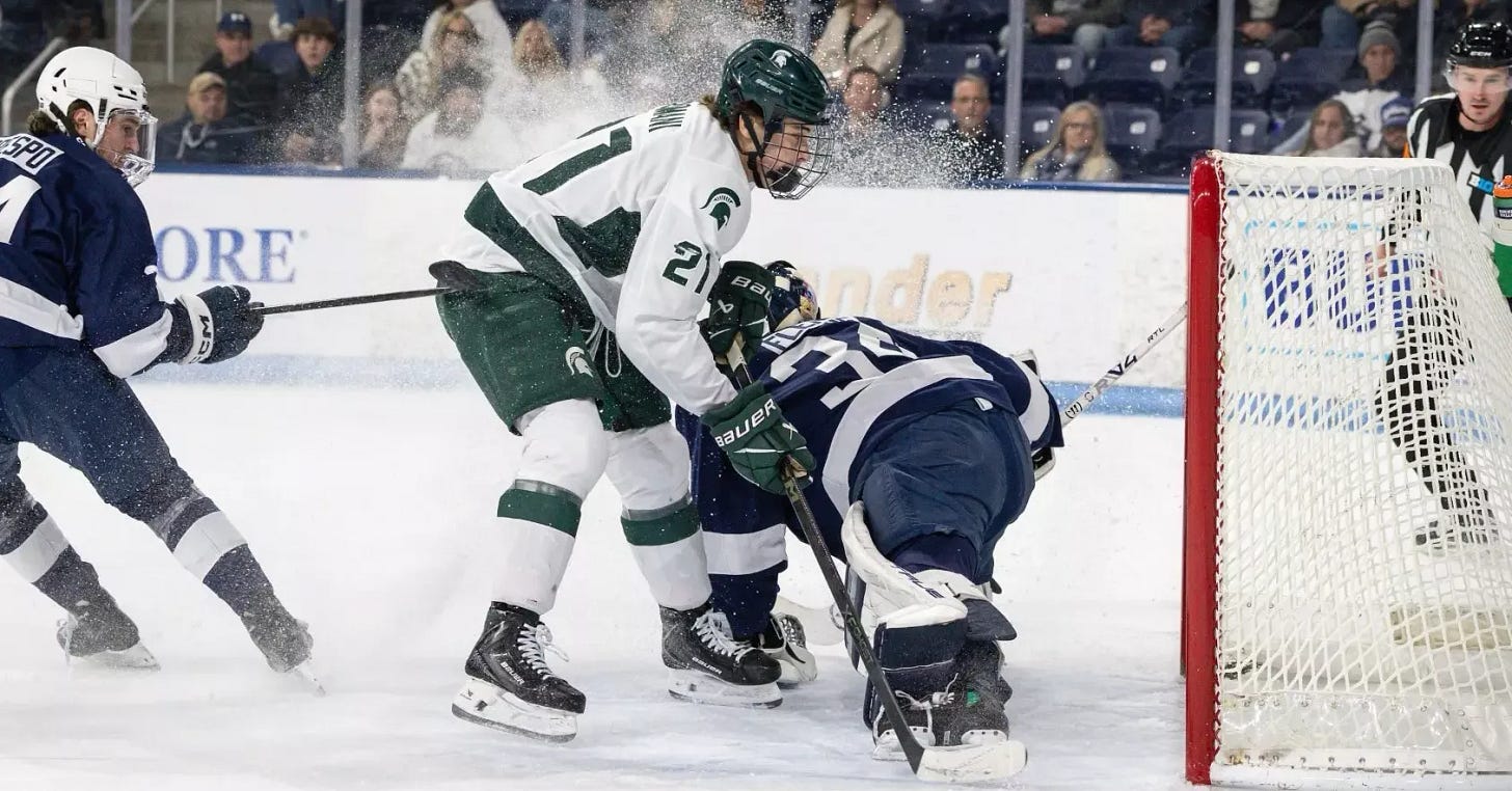 Michigan State 6, Penn State 3: Anthony Romani’s hat trick powered the Spartans to a Big Ten win in a game that veered into chaos at times, featuring 79 penalty minutes and three game misconducts. That included a cross-checking major and misconduct assessed to Gavin McKenna.