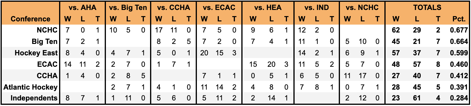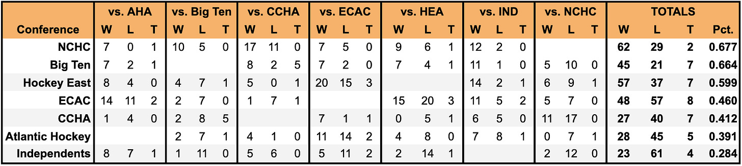 Overall, inter-conference records for each league factor considerably into the NPI. Traditionally, the NCHC, Hockey East, and Big Ten have had the most teams per season make the NCAA Tournament, and that’s because those leagues traditionally perform the best in inter-conference games.