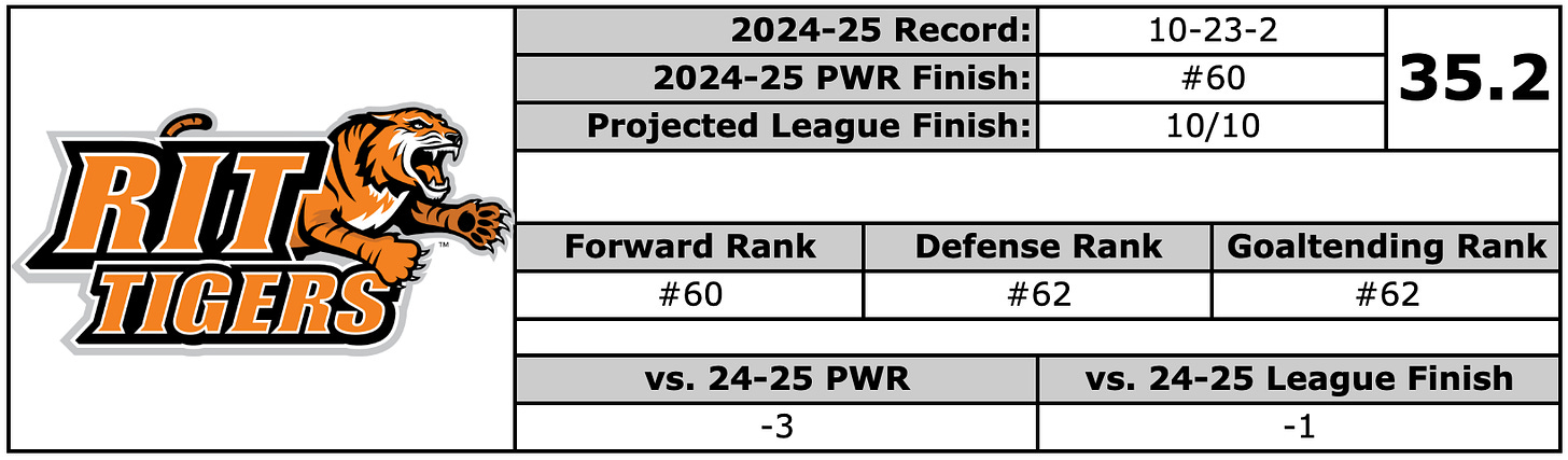 RIT finished last season ranked No. 60 in the Pairwise, and that was with Tyler Fukakusa and Matthew Wilde in the lineup. Both have since departed via the transfer portal, leaving the Tigers with a thinned-out forward group that wasn’t exactly deep to begin with.