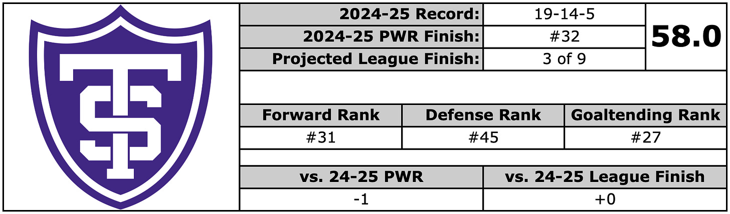 St. Thomas boasts some of the top talent in the CCHA, and that alone could be enough to carry the Tommies to a league championship this season. My rankings slot a few conference rivals slightly ahead, thanks to greater depth across the lineup, but it would hardly be a shock if the Tommies finished on top — just as the coaches projected in their preseason poll. With defenseman Chase Cheslock anchoring the blue line and forward Lucas Wahlin driving the offense, the foundation is there.
