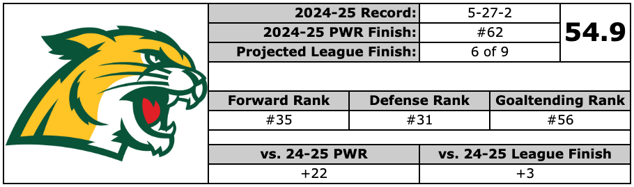 The roster, though, looks far more capable. Shyiak improved his overall roster quality through transfers and a handful of freshmen, particularly up front. On the blue line, the top four is effectively set with returners Tynan Ewart and Anthony Cliche, while I have sophomore Joe Schiller projected to take a major step after being limited to just 10 games a season ago. Cade Mason, a transfer from LIU, rounds out what should be a reliable top-four rotation.