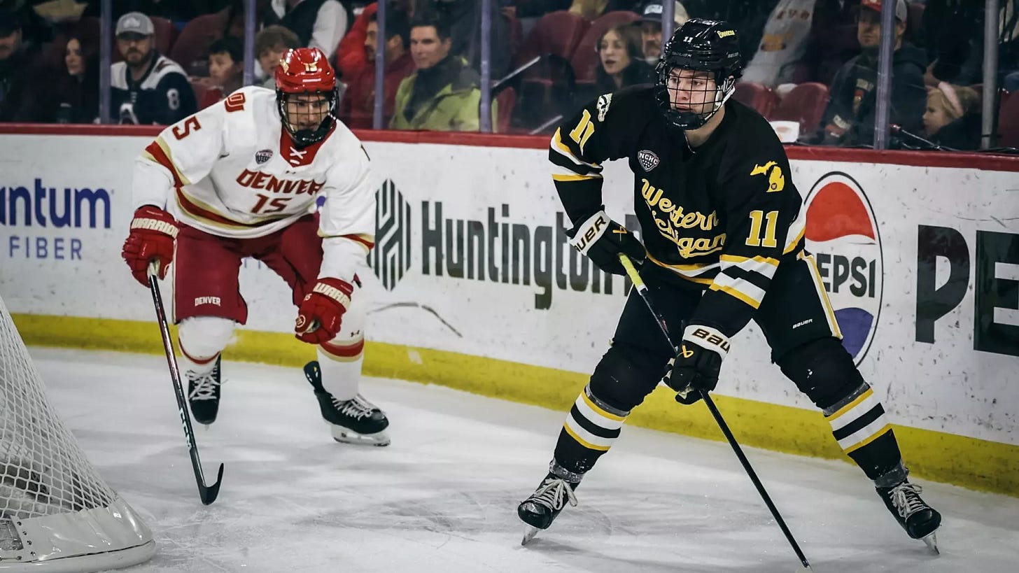 Western Michigan 6, Denver 2: The Broncos capped a big weekend with a sweep of Denver. Owen Michaels and William Whitelaw scored twice apiece, and Hampton Slukynsky turned aside 35 shots.